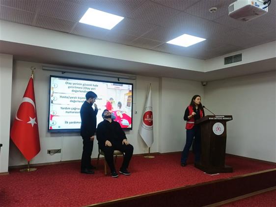 Türkiye Kızılay Eskişehir Şube Başkanlığı İlk Yardım Eğitmeni Melek KARAKOÇ tarafından verilen seminerde, acil durumlarda uygulanması gereken temel ilk yardım uygulamaları ile Heimlich manevrasına ilişkin bilgiler paylaşıldı. KARAKOÇ, kaza ve yaralanma durumlarında yapılması gereken doğru müdahaleleri ayrıntılı biçimde açıklayarak; temel ilk yardım becerileri, bilinç değerlendirmesi ve hava yolunun açılması gibi konularda katılımcılara uygulamalı ve kapsamlı bir eğitim sundu.